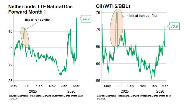 • Time. For now, our base case is that this latest episode will be relatively short-lived. Our rationale is simple: The Trump administration has developed a track record of fairly brief, focused military operations (e.g., Iran in June 2025 and Venezuela in January 2026). If that is indeed the case again this time, the direct economic impact would likely skew more toward temporary distortions than major inflection points, with markets quickly reverting to pre-war narratives. The most obvious historical comparison would be the price action for oil and natural gas during and after the U.S. and Israeli strikes on Iran in June 2025.